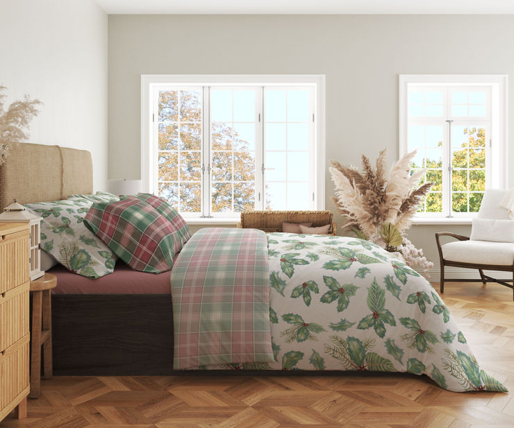 There is no flower more synonymous with the holidays than the poinsettia. Its petals sing with rich crimsons and golds, and it harkens to special holiday memories with family and friends. This collection evokes beautiful holidays past, bringing in hand painted illustrations of holly, berries, and pinecones. Festive plaids complement the illustrations, while also standing alone with their vibrant hues.