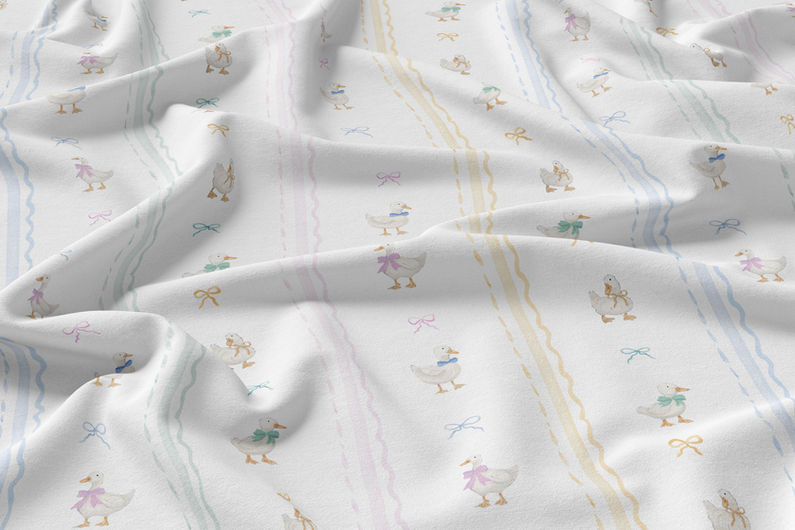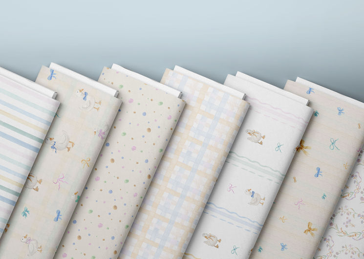This nursery-inspired pattern collection is full of all things soft, sweet, and coquette. Hand-painted gouache illustrations of various little geese all dressed up with bows take the lead, with complementing pinstripe, polka dot, and gingham in lovely pastel tones. Floral accents round out the collection and add elegance.